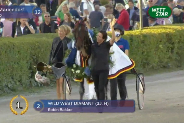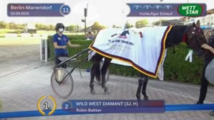 Wild West Diamant wint de 125e Deutsches Traber Derby in 1.12.1, nieuw Duits Derbyrecord, over 1.900 meter met Robin Bakker.