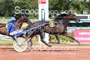 Enghien, 28 juli 2018 Broadwell wint de Prix la Tabatiere de Sarcelles in 1.13.3 over 2.150 meter met Matthieu Abrivard.