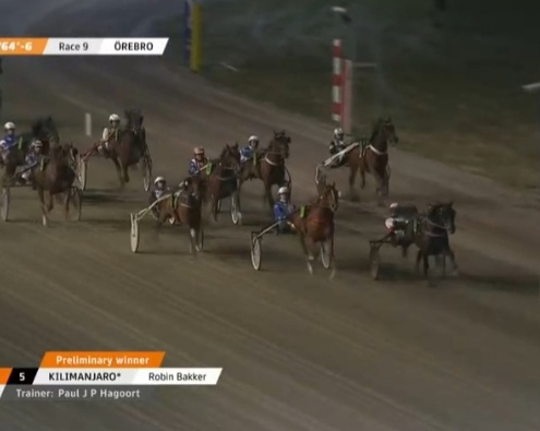 Orebro, 18 april 2023 Kilimanjaro wint de Ahlsell’s race in 1.13.1 over 2.140 meter met Robin Bakker.