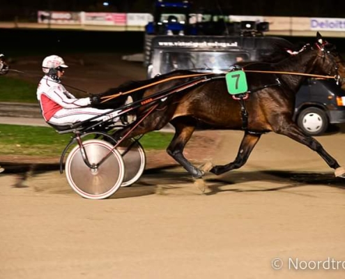 Wolvega, 26 februari 2023 Noxx Vrijthout wint de Prix Wolvega Live! in 1.12.7 over 2.100 meter met Robin Bakker.